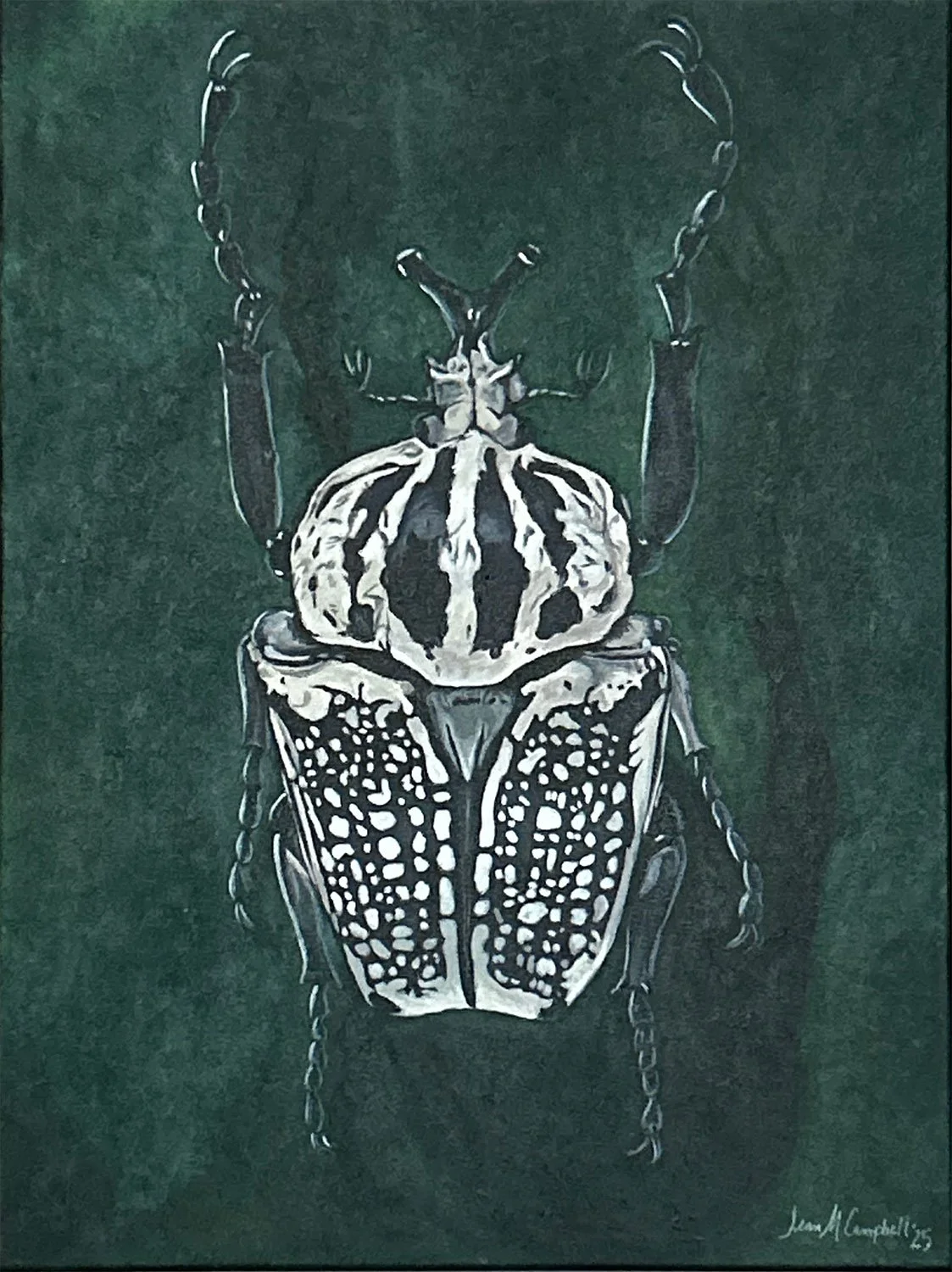 Painting of an amazing black and white beetle specimen. The pattern of the intricate white spots on a shiny black surface is echoed in the painted-on frame top right and lower left corners.