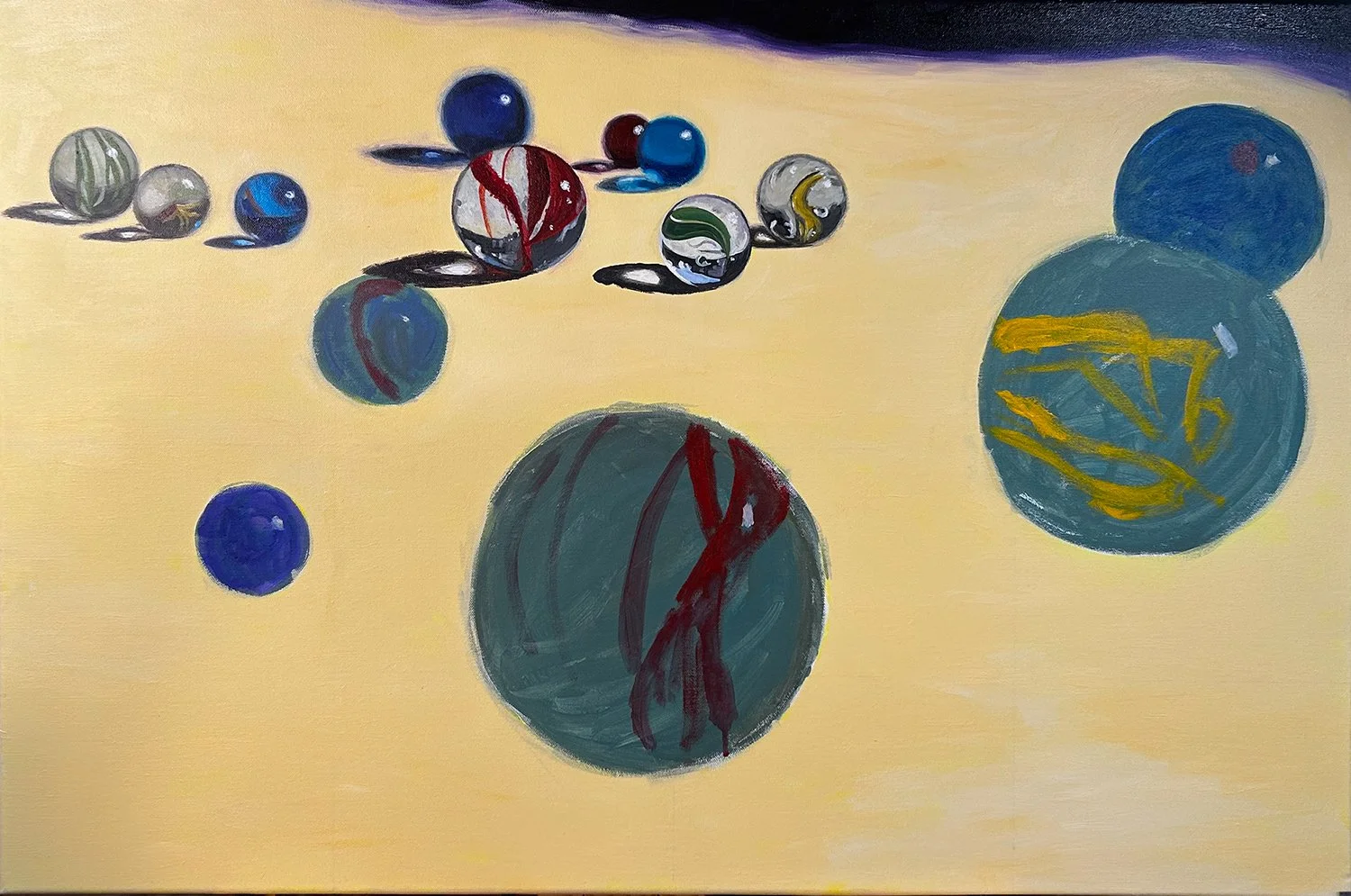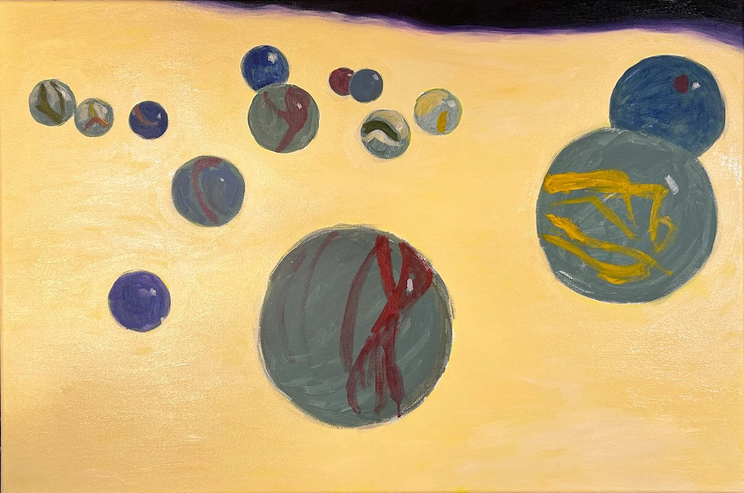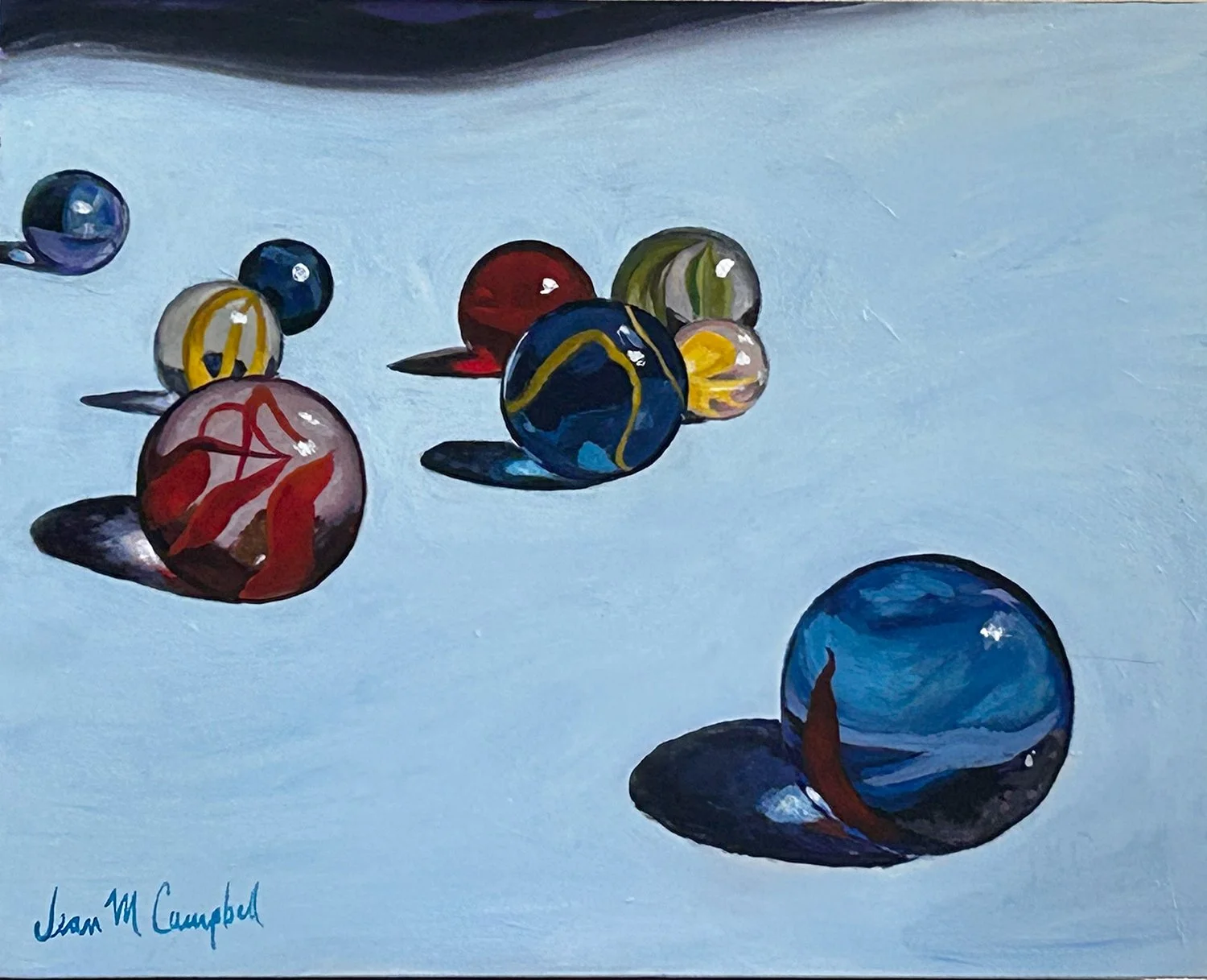 I dashed off my first small piece and called it “Keepsies,” a name taken from many of the marble games children play. I’d set up some still lifes with glass bottles and added a few marbles to add some visual interest. Upon contemplation, I found the marbles far more interesting and ignored the bottles altogether. I was happy with this 8” x 10” acrylic painting on canvas board, so I decided to go big.